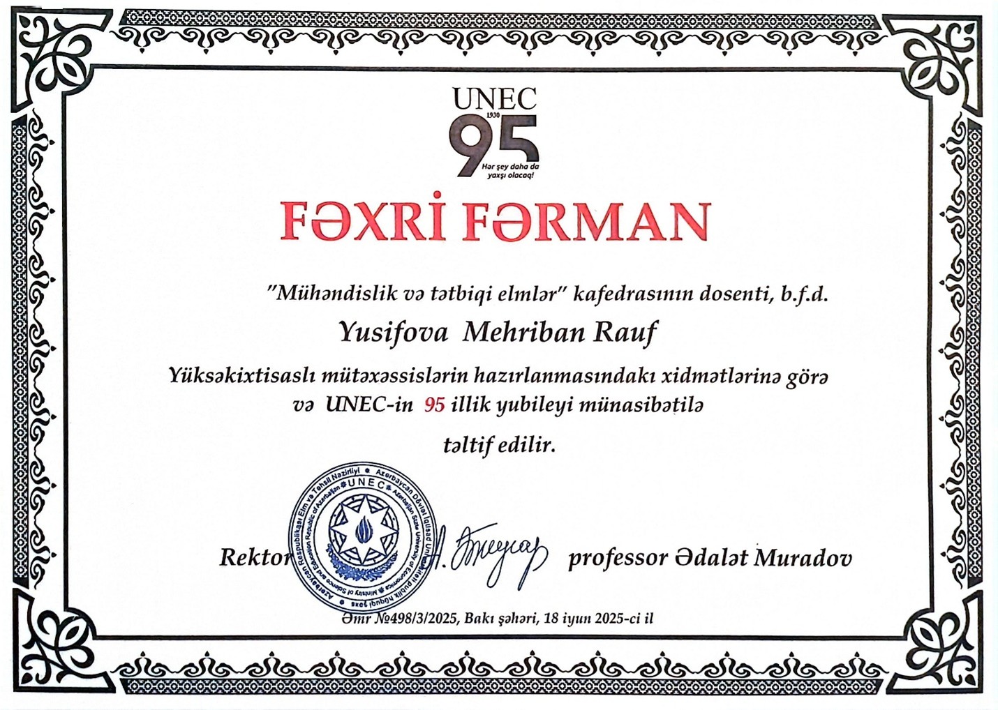 FƏXRİ FƏRMAN - Yüksəkixtisaslı mütəxəssislərin hazırlanmasındakı xidmətlərinə görə və UNEC-in 95 illik yubileyi münasibətilə, ƏMR №498/3/2025 (18.07.2025)