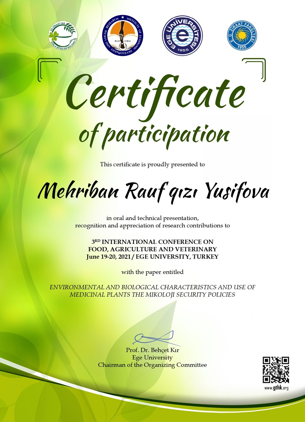 2014-cü ildə AMEA-nın Mikrobiologiya İnstitutunda “Qida təyinatlı müxtəlif materialların mikrobiotası və onların tullantılarının biokonversiyası” mövzusunda dissertasiya işini müdafiə edərək biologiya üzrə fəlsəfə doktoru elmi dərəcəsini almışdır.