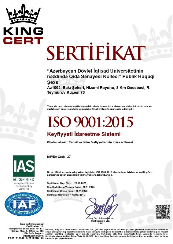 The Food Industry College operating under the Azerbaijan State University of Economics (UNEC) was established on 30 August 1955 by an order of the Ministry of Food Industry of the Azerbaijan SSR as the Baku Food Industry Technical School. By Resolution No. 112 of the Cabinet of Ministers of the Republic of Azerbaijan dated 16 June 2010, the Baku Food Industry Technical School was renamed the Baku Food Industry College. Pursuant to Resolution No. 250 of the Cabinet of Ministers of the Republic of Azerbaijan dated 10 July 2020, the Baku Food Industry College was reorganized as the Food Industry College under the Azerbaijan State University of Economics (UNEC) and granted the status of a public legal entity.